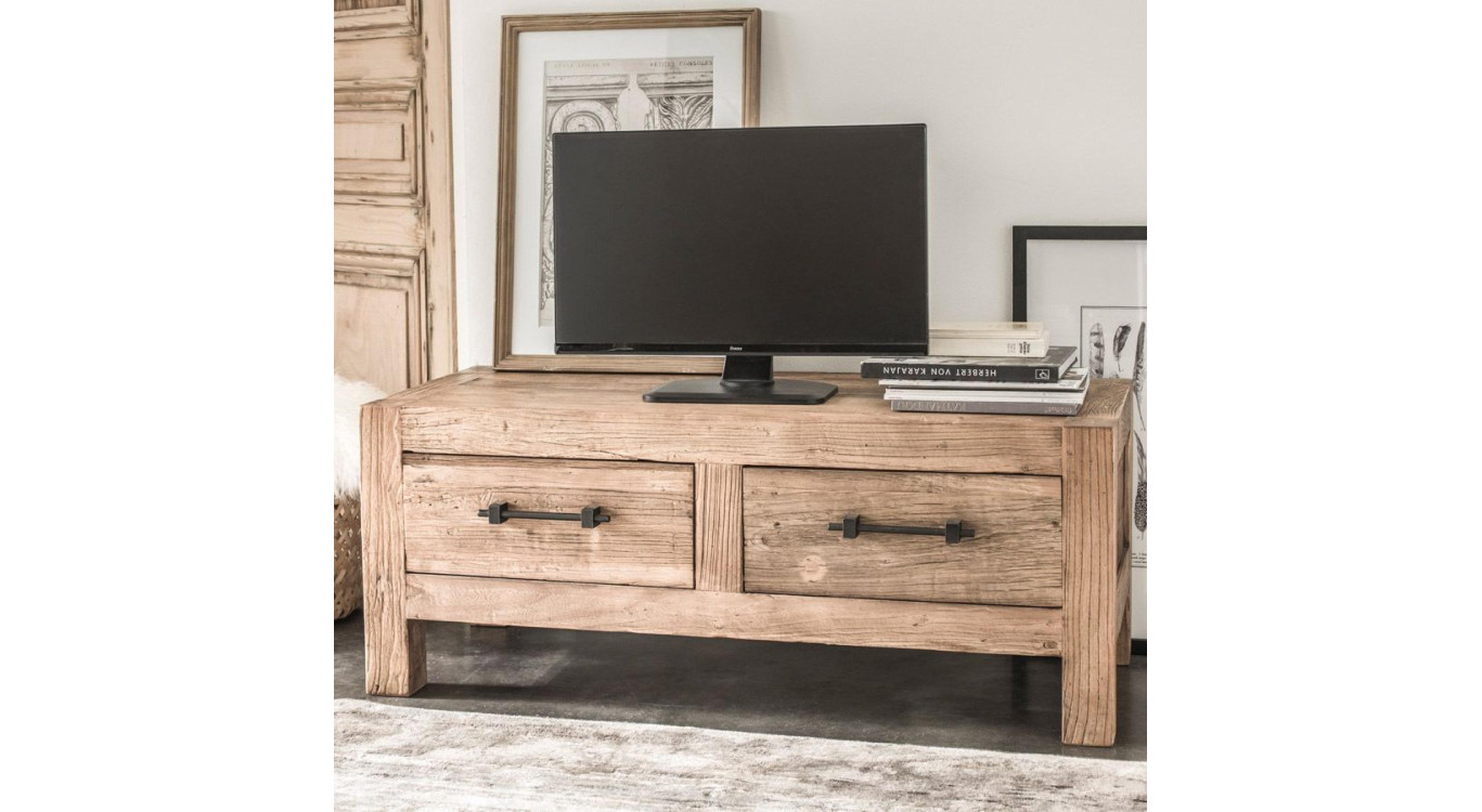 Matériaux : Structure du meuble en Orme et Pin recyclés Le dos du meuble, en pin recyclé Poignée en acier, Noir Fonctionnalités : 2 faux tiroirs à abattant basculant vers le bas pour le rangement d´appareil hifi 2 perçages pour le passage des câbles dans la niche des faux tiroirs (1 horizontal + 1 vertical dans la niche) Pas de perçage à l´arrière du meuble Entretien : L´orme recyclé présente des reliefs profonds et des variations de couleurs qui font partie de l´identité de la collection Meuble unique vendu en l´état : les entures, tâches et irrégularités de la patine témoignent de l´utilisation du bois massif recyclé Ne pas utiliser de produit ou matériau abrasif A l´intérieur du meuble utiliser uniquement un chiffon sec (ne pas utiliser d´éponge)